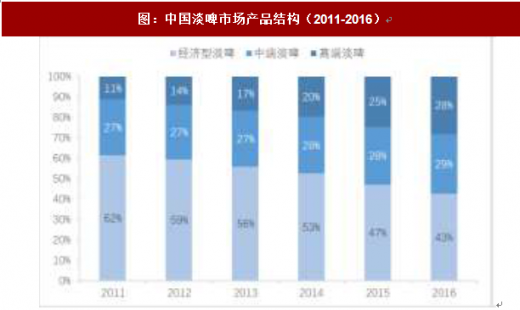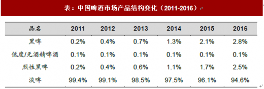 表:中国啤酒市场产品结构变化(2011-2016)