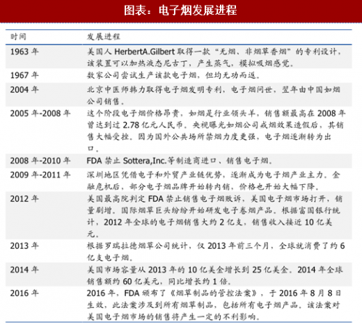 电子烟最早由美国人 herberta.gilbert 取得一款“无烟、非烟草香烟”的专利设计,2004 年,北京中医师韩力取得电子烟发明专利,电子烟问世,第二年由中国如烟公司销售。