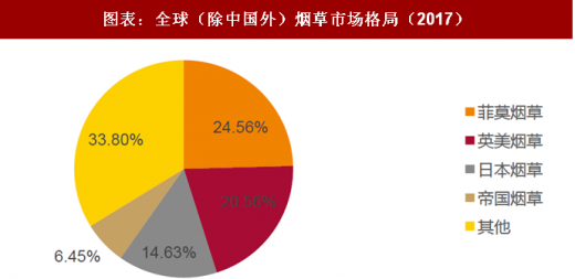 菲莫国际、英美烟草、日本烟草和帝国烟草是全球四大烟草巨头。2017 年全球(不包含 中国)烟草市场中,菲莫国际、英美烟草、日本烟草和帝国烟草的市场占有率分别为 24.56%、 20.56%、14.63%和 6.45%,四大巨头的占有率合计达到 67.2%,几乎垄断了除中国以外的烟 草市场。除此以外,还有雷诺烟草、奥驰亚等区域性品牌。随着英美烟草对雷诺烟草的收 购,四大巨头的占有率仍将继续提升。