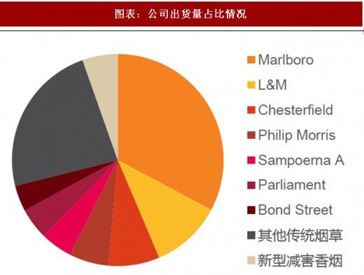 传统品牌包括 marlboro(万宝路)、parliament(百乐门)、bond street、chesterfield、 l&m、lark、philip morris 等 7 大国际品牌以及众多地方品牌,包含高档、中档和低档品 牌,品牌矩阵完善。2018 年 1 季度,公司的 7 大国际品牌出货量占总出货量的 71.1%左右, 其中 marlboro(万宝路)是世界卷烟领先品牌,2017 年 marlboro 占国际卷烟市场(中国 除外)份额的 9.7%。