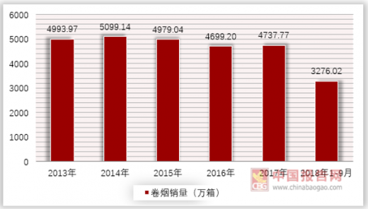 虽然我国烟民数量不断增加,但卷烟销量却没有随之增长,从2014年到2016这三年,我国卷烟销量从5099.14万箱下降至4699.2万箱,两年降幅达到7.84%。在2017年我国卷烟销量才止跌回升,增幅为0.82%。2017年前九月我国卷烟销量达到3276.02万箱,距离2018年销量目标4750万箱还差1473.98万箱,相当于3个月需要销售全年31%的卷烟,任务艰巨,若不达标,则我国的卷烟销量下降态势将会继续持续,卷烟行业的“寒冬”将会降临。