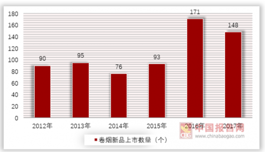 为了推动卷烟行业的发展,卷烟企业不断推出新品牌,尤其是2016年面临卷烟销量连续两年下降的情况下,卷烟企业共推出171款新产品,也许是尝到了推出新品对销量增长有作用的甜头,2017年也推出了148款新产品。