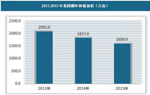 数据显示,2015年我国烟叶种植面积为1609.9万亩,全年烟叶产量为299.45万吨。