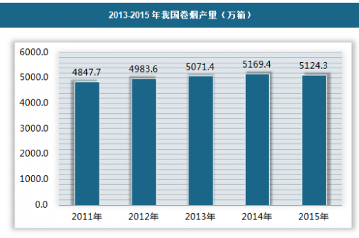 2015年,我国卷烟产量为5124.3万箱,同比下降0.88%。