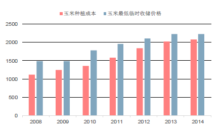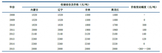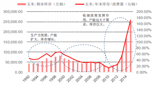 玉米临时收储政策对国内玉米价格影响很大。1998-2003年,我国粮食价格震荡下行,尤其在2000年5月,玉米价格仅为914.55元/吨。同时,这一时期风调雨顺,玉米产量持续增加,出现了卖粮难的局面。为避免“谷贱伤农”,我国自2008年开始实行临时收储政策,调到农民生产积极性,保证粮食供应及粮食安全。2008-2015年,我国玉米产量持续增长,2015年玉米产量高达22458万吨,年末库存消费比为172.35%,行业产能严重过剩,造成了玉米库存量巨大、国内外价格倒挂等诸多问题。