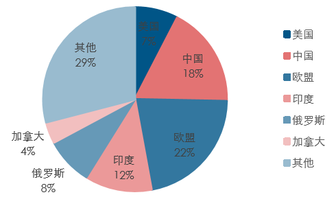 小麦为世界播种面积最大、产量最多、分布最广的粮食作物。目前全球种植面积超220万公顷,年产量7.3亿吨,占世界粮食总产量的1/3。从国别来看,世界小麦产量最大的国家是中国,其次是印度、美国和俄罗斯,四国产量之和占世界总产量的比例为45%。由于自然条件和国土面积等原因限制,各地区小麦种植面积和单产差异较大。小麦类型和品种繁多、分布广,对土壤、气候条件适应性强,耐寒、耐旱、稳产、高产;但是遇到极端天气爆发时,小麦的生产与价格依然会受到影响。