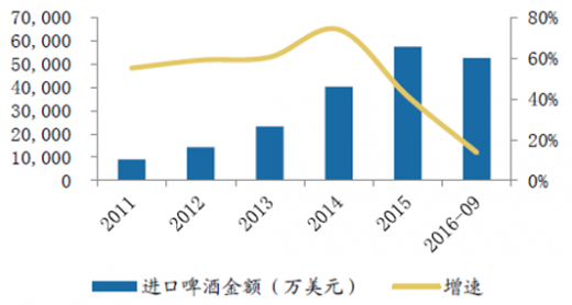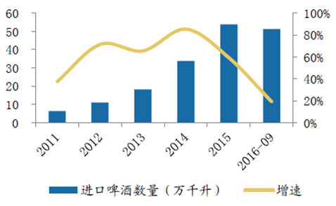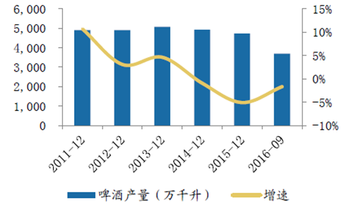 2016年1-9月啤酒销量仍呈小幅下滑态势。近几年,我国啤酒人均消费量已达国际平均水平,行业已进入低速扩容阶段。2015年,我国啤酒产量达4715.70万千升,同比下降5.10%,累计完成销售收入1897.09亿元,同比增长1.52%。2016年1-9月我国啤酒产量达3685.30万千升,同比下降1.70%,延续了2015年下滑态势。