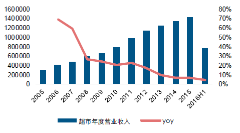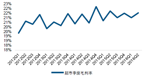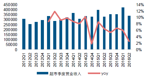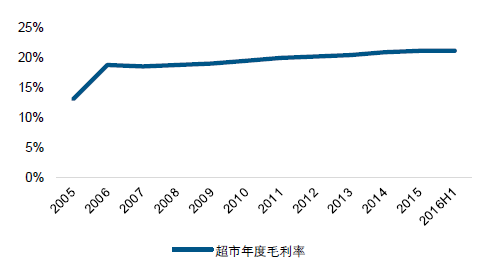 2016年,超市保持4%左右增长,毛利率创历史新高。2016上半年超市收入同比增长4.5%,增速同比下降3.18个百分点。2016年二季度超市营业收入同比增长2.63%,增速环比下降3.42个百分点,同比下降3.81个百分点。受电商加速布局商超o2o及电商物流效率持续提升等因素影响,实体超市企业分流压力日益加大致收入增速持续下滑。