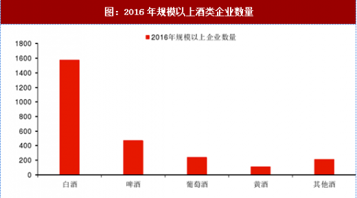 从企业数量角度看,2016年规模以上白酒企业为1578家,啤酒企业468家,葡萄酒企业240家,黄酒企业112家。