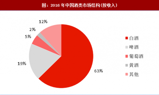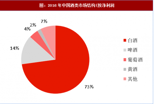 从收入和利润角度看,根据国家统计局的数据,2016年全国规模以上的酒业企业实现销售收入9780.63亿元,其中规模以上白酒企业实现销售收入引25.74亿元,占据酒类行业总收入的63%; 2016年全国规模以上酒业企业实现净利润1094.47亿元,其中规模以上白酒企业实现净利润797.15亿元,占据酒类行业净利润的73%。
