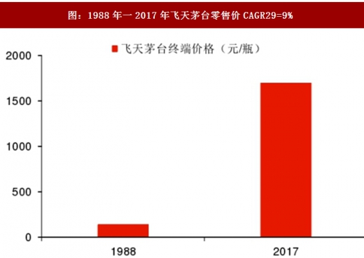 高端白酒的代表飞天茅台的终端价格在1988年(放开价格管制,开始由市场定价)到2017年期间从140元增长到1700元,29年间的复合增速为9%,明显高于同期的cpi增长水平,因此仅从通货膨胀的角度或者消费品属性的角度无法解释白酒价格的上涨幅度。