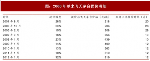 在产品需求增长强劲、供给短期内难以较大幅度增加的大背景下,进2000年后茅台持续上调出厂价,这是终端价格实现了持续增长的重要原因之一。从2000年到2017年,贵州茅台共9次上调飞天茅台的出厂价,最近的一次是2012年1月,飞天茅台的出厂价从619元上调至819元,上调幅度32%。