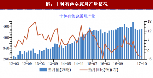 受我国经济增速放缓,以及供给侧改革和环保限产的政策影响下,我国主要有色金属的月产量也出现逐步减少的趋势。2017年10月,我国十种有色金属月产量为445.90万吨,同比增幅为-3.30%,而去年同期的产量为454.80万元,同比增幅为3.20%。