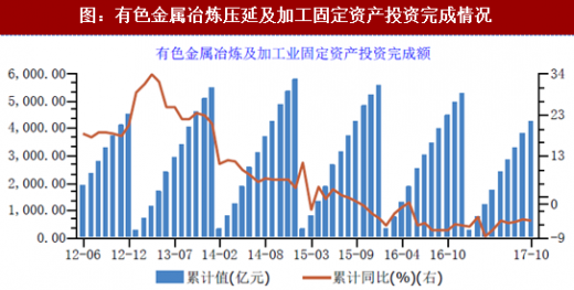 在由投资主导的经济高增长时代逐步退出以后,各行业的投资增速都有不同程度的下降,有色金属也不例外。其中,有色金属矿采选业固定资产投资完成额下降幅度较大,2017年1-10月投资完成额为955.87亿元,同比增长-21.30%,而去年同期的投资完成额1217.46亿元,同比增幅为-8.70%。而有色金属冶炼压延及加工固定资产投资完成额下降幅度较去年同期有所减少,2017年1-10月投资完成额为4238.62亿元,同比增长-4.60%,而去年同期的投资完成额4462.51亿元,同比增幅为-7.10%。