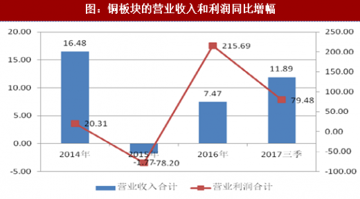 随着铜产品的价格不断走高,铜行业的主要财务指标开始好转。在营业收入同比增速方面,铜行业从2016年的7.47%提高到今年三季度的11.89%;在营业利润同比增速方面,铜行业从2016年的215.69%回落到今年三季度的79.48%;在盈利能力方面,铜行业的销售毛利率由2016年的4.25%升高到今年三季度的4.81%。
