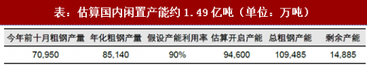 为了估算总产能中已经开启的部分,我们不妨以今年前10月粗钢生产数据为基准进行年化,得到全年预计粗钢产量约8.5亿吨,同时假设产能利用率约90%,进而倒推出已经开启的产能约9.46亿吨,剩下的约1.49亿吨产能,也就是目前存在复产可能的部分。