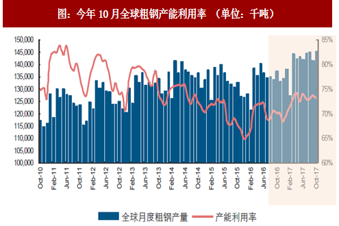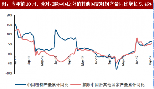 虽然,截止到2017年10月,全球粗钢产能利用率也仅73%,同比提升约3%,距离2009年以来最高点83.9%尚有不小复产空间。但是,如同国内一样,海外钢铁盈利好转也始于2016年,连续两年盈利好转之下,海外粗钢产量近两年同比增速分别为0.65%、5.10%,并未表现出足够的弹性。背后的原因可能在于:1)与国内钢铁供给状况类似,海外供给可能存在部分产能已经淘汰退出,并且复产越晚的产能边际成本越高,复产的动力越弱;2)存在结构性过剩问题——由于贸易保护及信息不对称带来摩擦性成本等,导致供给无法全球化畅通流动,带来局部过剩与紧缺同时存在。
