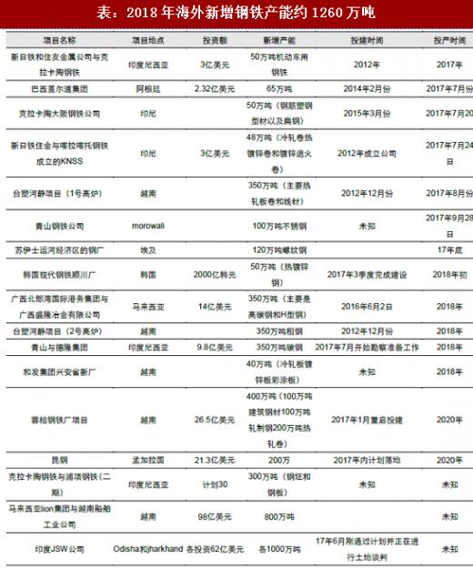 受制于以上因素,未来海外钢铁行业供给增量,大概率并非是存量产能在盈利驱动之下,通过利用效率提升所能实现,更多需要依赖于新增产能投放。据不完全统计,2018年海外新增钢铁产能约1260万吨。同时,需要关注的是,从历史经验来看,海外供给投放过程可能也并非一帆风顺。