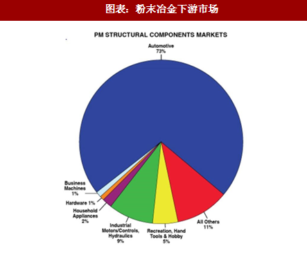粉末冶金零件应用于各种市场,汽车行业是主要的应用领域,约占 70%。其他重要的市场包括娱乐,家用电器,工业电机及控制,硬件和商业机器等。