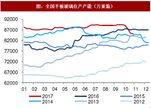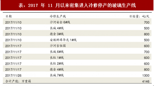 河北是国内重要的玻璃生产基地,前期邢台因环保趋严出台针对玻璃行业的采暖季限产 15%的规划(2017 年 9 月邢台市出台《关于做好邢台市 2017—2018 采暖季错峰生产攻坚行动的紧急通知》,采暖季当地玻璃企业限产,当地 31 条生产线(生产线数量约占全国在产生产线数量 14%)限产 15%),同时 11 月中旬后沙河玻璃因排污许可证事件出现超预期的产能关停。沙河玻璃生产线关停显著缓解行业的供给压力,目前玻璃行业在产产能约 8.6 亿重箱、同比降约 1.3%。