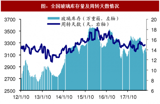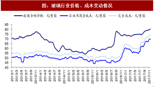 2016 年 4 月开始企业基于需求复苏、高盈利景气预期,冷修产能复产进程加快, 2017 年 10 月末行业在产产能同比增约 2%、较 2016 年初增约 12%。产能复产后发挥时间有限,行业库存压力不大,2017 年玻璃价格表现坚挺;但 3 季度之后纯碱等原材料价格大幅上行,行业供需边际不强,成本上行对行业盈利有一定侵蚀。2017 年 1-11 月全国玻璃含税均价约 75 元/重箱,同比上涨 17%。