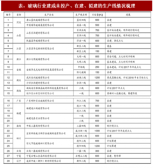 关注环保导致产能收缩的持续性及范围扩充可能,同时环保、供给侧改革大背景下在建产能的投放进程有可能会受到影响。目前政策介入驱动去产能执行力度较强的仅河北邢台市沙河地区,关注后续其他地区动向。此外,环保、供给侧改革大背景下在建产能的投放进程有可能会受到影响:根据卓创资讯统计数据,目前玻璃行业建成未投产、在建、拟建的生产线的生产线有 28 条,合计年产能约 1.07 亿重箱,占目前全国玻璃在产能约 13%,这部分产能投放有可能会面临一定的政策阻力。
