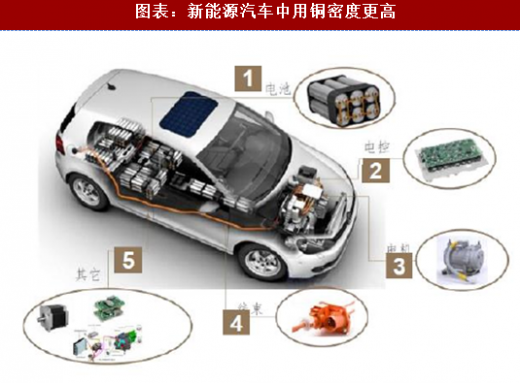 与传统内燃机汽车相比,新能源汽车用铜密度更高,纯电动汽车单车用铜量超过 80kg,是内燃机汽车的三倍左右,除新能源汽车外,充电设施会使用大量的电力电缆和装备用线,以上领域未来均会对铜消费产生拉动。