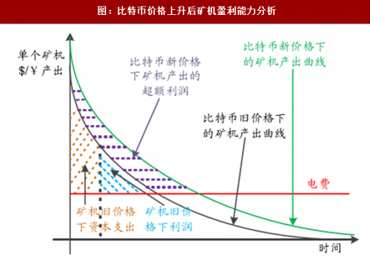 绿色曲线表示当比特币兑法定货币如美元/人民币价格上涨并保持一定水平后,同一台矿机的法定货币收益曲线,相比黑色曲线有着明显的上升。而紫色区域则表示同一台矿机可能获得的超额利润。从图中可见紫色区域面积并不小,意味着比特币价格的暴涨暴跌对矿机盈利能力的影响也较大。