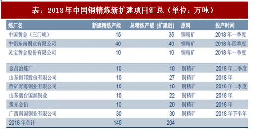 中国精炼铜产能将进入快速扩张期。中国的下一轮投产高峰期在2018年和2019年,对铜精矿的需求增长则将体现在2019和2020年。根据smm数据,2018年中国新建铜精炼产能145万吨,较2017年50万吨的产能释放相比大幅提升。