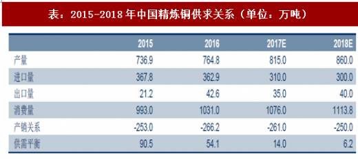 中国精炼铜供应处于紧平衡。根据安泰科数据,预计2018年中国精炼铜产量860万吨,同比增长5.5%;我们预测,2018年中国精炼铜供应过剩量收窄至6.2万吨,主要是上游铜精矿制约精炼铜产量增长速度放缓,以及下游需求保持稳定。