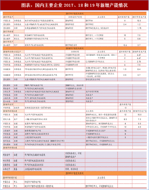 从供给角度来说,大企业新增有序,小企业由于资金和技术等问题,有效产能投放低于预期:目前国内新增产能主要来自主流厂商新建以及冷修技改。根据我们测算:2018 年主要大企业有效产能增加约为 27 万吨左右,同比增长 8%左右。巨石和泰玻有效产能增加 16 和 5~6 万吨左右,重庆国际总的产能冲击可能为负,长海股份产能冲击为 6 万吨左右。(备注:产能冲击=2018年有效产能-2017年有效产能)。重庆三磊8.5 万吨产线于15年底开工建设,最终落地时间是17年11月底,比原计划时间晚了一年时间,1月15日成功生产出无碱玻纤产品,预计 18 年新增有效产能为 7.3 万吨。九鼎新材5万吨产线从首次披露至今已超过 5年时间,但是产线仍未达产,2016年项目亏损1831.11万元。昆山必成、上海天玮、中材金晶、江西大华等于2015和16年冷修技改的线投产时间暂不确定。中材金晶、江西元源、林州光远、清远建韬原定于17 年底和 18 年投产的线目前情况也不是很乐观。值得注意的是,主流企业新增和冷修产线均为高端用途产线,技术壁垒相对较高;其他小企业可能新增的产线大多用于建筑建材等低端领域,2018 年的真实产能冲击有限,但是产能集中投放仍有可能对中低端市场短期造成一定冲击,这也是值得重视的风险。