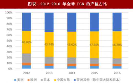 图表:2012-2016 年全球刚性覆铜板的产值占比