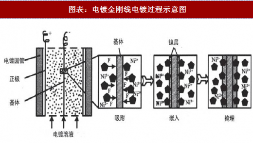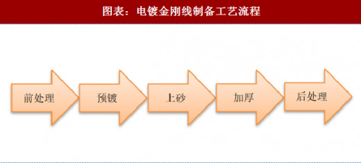 目前金刚线的主流制备工艺是电镀金刚线。制作过程包括前处理、预镀、上砂、加厚和后续处理等。