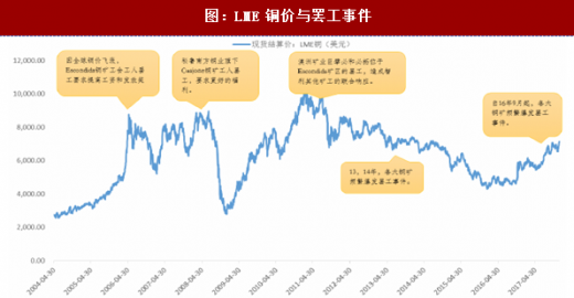 自2015年至今,铜价已上涨50%左右,2017年劳资纠纷频发,造成供给收缩约110万吨(金属量)。2018年仍是劳资谈判大年,同时铜价运行中枢有望进一步上行,2018年铜矿干扰率(罢工、自然灾害等造成的减产与全年铜矿产量的比率)仍会维持较高水平,将有效对冲新增供给。