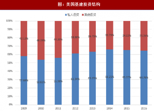 电网是美国基建方面较为薄弱的一环,降雪导致大规模停电事件时有发生,电网建设有望处于基建优先地位。根据近十年来美国投资结构来看,政府与私人的比例在4:6,若特朗普基建计划顺利实施,我们保守估计至少拉动基建总投资额1.5万亿美元以上。同时近十年,美国基建投资的内生增长率在2.8%,若考虑1.5万亿的新增投资额,未来十年美国基建投资复合增长率有望达到5.4%。