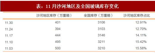 近期沙河停产的12条生产线在产产能约7850吨/日,占沙河地区在产产能的27.4%,约占全国在产产能的5.2%,对沙河地区玻璃供给冲击较大,当地库存下降明显,极大缓解华北乃至周边地区玻璃现货行业供需矛盾。11月最后一周库存小幅上升是由于沙河地区为了限制汽车尾气排放,禁止卡车进入玻璃厂装货,为期一周,导致企业库存小幅上升,但是当地贸易商库存较低,当地玻璃价格也随之上涨,较10月末沙河地区玻璃价格普遍上涨70元/吨。沙河地区的总产能约占全国总产能的14.44%,产能较为过剩,当地玻璃价格是全国洼地,而且过往进入冬季之后,北方开工量减少,沙河玻璃开始南下,导致华中、华东地区玻璃价格下降。今年不同于以往,过年较晚导致北方开工量不差,玻璃需求没有大幅下降,叠加玻璃限产停产,沙河玻璃没有南下,华东、华中甚至华南地区玻璃价格也跟进上涨。全国玻璃11月30日均价达到1636元/吨,比10月末高出26元,玻璃价格淡季不淡是供求关系改善最明显的反映,此次环保限产的影响深远。政府加大了对玻璃企业批建不符的督查力度,要求平板玻璃企业在2018年1月1日之前必须完成排污许可证的申领,不然要求停产。预计全国仍有10条左右的玻璃生产线不符合环保要求,若不能在截止日前获取排污许可证,关停产线将导致供给侧产能再次收缩。