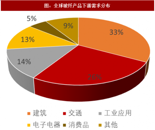 从玻产品下游需求分布上看,在我国玻纤产品的传统需求主要分布在建筑、电子电器、管罐、工业应用等领域,合计占到93%左右;在世界范围来看,全球玻纤产品传统需求分布在建筑、交通、工业应用等领域,合计占到86%左右。
