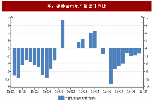 铅的主要用途是铅酸蓄电池,而铅酸蓄电池主要用在汽车、通讯电源、电动自行车等用途上,因而铅的下游需求行业相对集中。铅酸蓄电池为世界上产量最大的电池产品,生产量占全部电池总量的50%,占充电电池的70%,即便是欧美日等世界上最发达的国家和地区,至今也仍大量生产和使用铅酸蓄电池。从全球铅酸蓄电池产能规模来看,中国是生产大国,产量占全球的比重达到45%左右,其次是美国,产量占比约为32%,日本位居第三,占比接近13%。随着全国环保巡查工作的全面实施,铅酸蓄电池行业面临更加沉重的环保压力;同时铅价的持续上涨,企业利润空间进一步被压缩,面临更大的生存压力,2017年以来我国铅酸蓄电池产量累计同比持续出现了负增长。国际铅锌研究小组预测2018年全球铅消费增长0.9%,中国增长1.2%,需求增长大幅减弱。