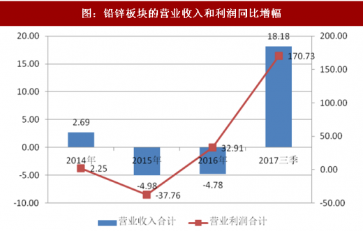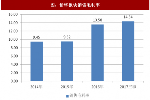 随着铅锌产品的价格不断走高,铅锌行业的主要财务指标开始好转。在营业收入同比增速方面,铅锌行业从2016年的-4.78%提高到今年三季度的18.18%;在营业利润同比增速方面,铅锌行业从2016年的32.91%提升到今年三季度的170.73%;在盈利能力方面,铅锌行业的销售毛利率由2016年的13.58%升高到今年三季度的14.34%。