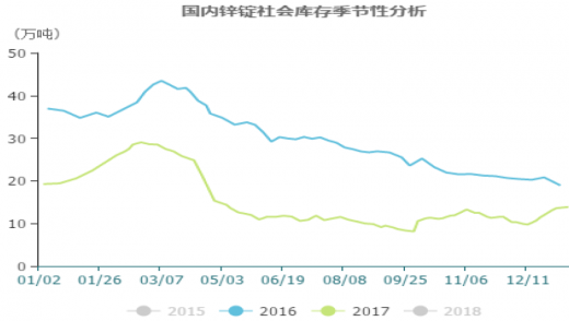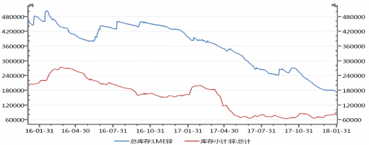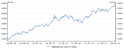 2017年锌价在三季度阶段呈单边上扬,主要是国内外锌市基本面的强势支撑。上游锌精矿原料延续去年的供应缺口,尤其中国市场因环保政策令锌精矿供应缺口未能如预期得到缓解,导致锌精矿加工费一低再低,从而传导至冶炼厂家的集中检修减产,在国内外需求保持增速的前提下,精炼锌缺口很快形成,锌社会库存骤低至10万吨,而期货锌去库存化明显,至2017年底,lme锌库存量降至18万吨附近,创下近十年新低,shfe锌库存量低至7万吨附近,导致市场濒临逼仓。在集聚了缺原料、短产量、低库存、高需求等的利好条件之下,锌价再创新高也就顺理成章了。