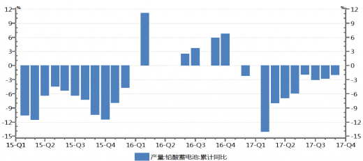 2、环保和成本压力影响下游需求铅的主要用途是铅酸蓄电池,而铅酸蓄电池主要用在汽车、通讯电源、电动自行车等用途上,因而铅的下游需求行业相对集中。铅酸蓄电池为世界上产量最大的电池产品,生产量占全部电池总量的50%,占充电电池的70%,即便是欧美日等世界上最发达的国家和地区,至今也仍大量生产和使用铅酸蓄电池。从全球铅酸蓄电池产能规模来看,中国是生产大国,产量占全球的比重达到45%左右,其次是美国,产量占比约为32%,日本位居第三,占比接近13%。随着全国环保巡查工作的全面实施,铅酸蓄电池行业面临更加沉重的环保压力;同时铅价的持续上涨,企业利润空间进一步被压缩,面临更大的生存压力,2017年以来我国铅酸蓄电池产量累计同比持续出现了负增长。国际铅锌研究小组预测2018年全球铅消费增长0.9%,中国增长1.2%,需求增长大幅减弱。