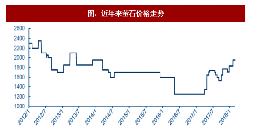 目前国内的萤石几乎一半都用于氢氟酸的生产,另外氟化铝是萤石的第二下游市场。由于下游市场相对比较稳定,需求仍较坚挺,因此2018年供需矛盾将更甚于2017年,我们预计2018年萤石产品的均价将明显高于2017年。