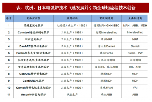 表:欧洲、日本电弧炉技术飞速发展并引领全球短流程技术创新