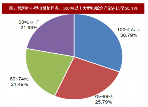 (二)装备水平:我国中小型电弧炉居多,100吨以上大型电弧炉产能仅占30.79%