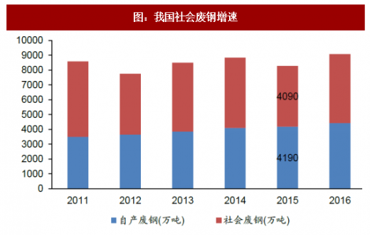根据中国废钢铁应用协会和我的钢铁网统计数据,2016年我国废钢产量达9075万吨,同比增长9.60%;其中自产废钢4430万吨、社会废钢4645万吨,分别同比增长5.73%和13.57%,社会废钢产量增长更快。