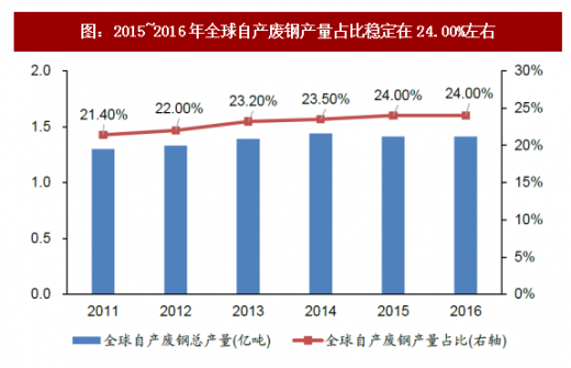 图:2015~2016年全球自产废钢产量占比稳定在24.00%左右