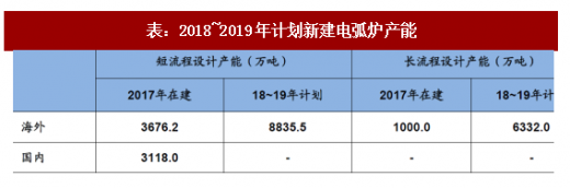 《capacitydevelopmentsintheworldsteelindustry》2017年海外在建短流程电弧炉产能为3676.2万吨,2018~2019年计划新建电弧炉产能为8835.5万吨;国内已官方宣布进行产能置换新建电弧炉设计产能为3118万吨