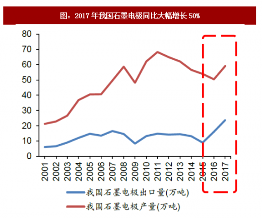 2017年石墨电极国内价格暴涨,海外需求攀升,国内、海外两个市场均重现繁荣。国内,受“地条钢”出清、电弧炉产能增长、炭素企业环保限产等因素共同作用,2017年国内石墨电极价格暴涨,显示国内石墨电极市场供不应求。同时,2017年我国石墨电极出口量达23.73万吨,同比2016年大幅增长50%,创下2001年以来最高增速,显示海外石墨电极需求强劲。
