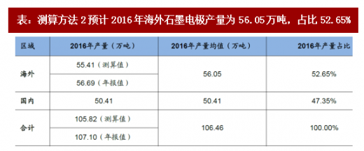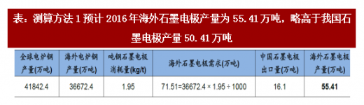 表:测算方法1预计2016年海外石墨电极产量为55.41万吨,略高于我国石墨电极产量50.41万吨