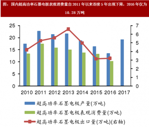 国内超高功率石墨电极表观消费量自2011年以来连续5年出现下降,2016年仅为10.28万吨,占同期石墨电极表观消费量的29.96%。根据方大炭素2017年年报,2017年我国超高功率石墨电极产量达19.24万吨,同比2016年大幅增长42.62%,增速显著快于石墨电极产量增速;国内超高功率石墨电极表观消费量自2011年以来连续5年出现下降,2016年国内超高功率石墨电极表观消费量为10.28万吨,同比2015年大幅下降22.12%,仅占同期石墨电极表观消费量的29.96%。